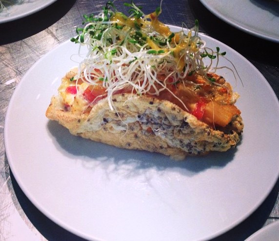 Omelete de claras com chia, palmito pupunha sauté – servido com mini salada verde e sementes.