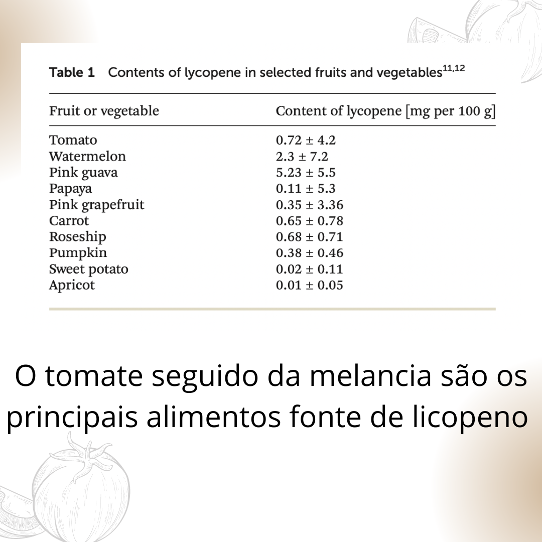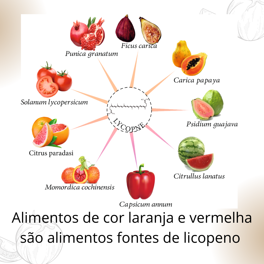 O licopeno composto presente em vegetais de cor laranja e vermelha como tomate, melancia, laranja, cenoura, mamão, goiaba, pimentão vermelho e romã, por exemplo.