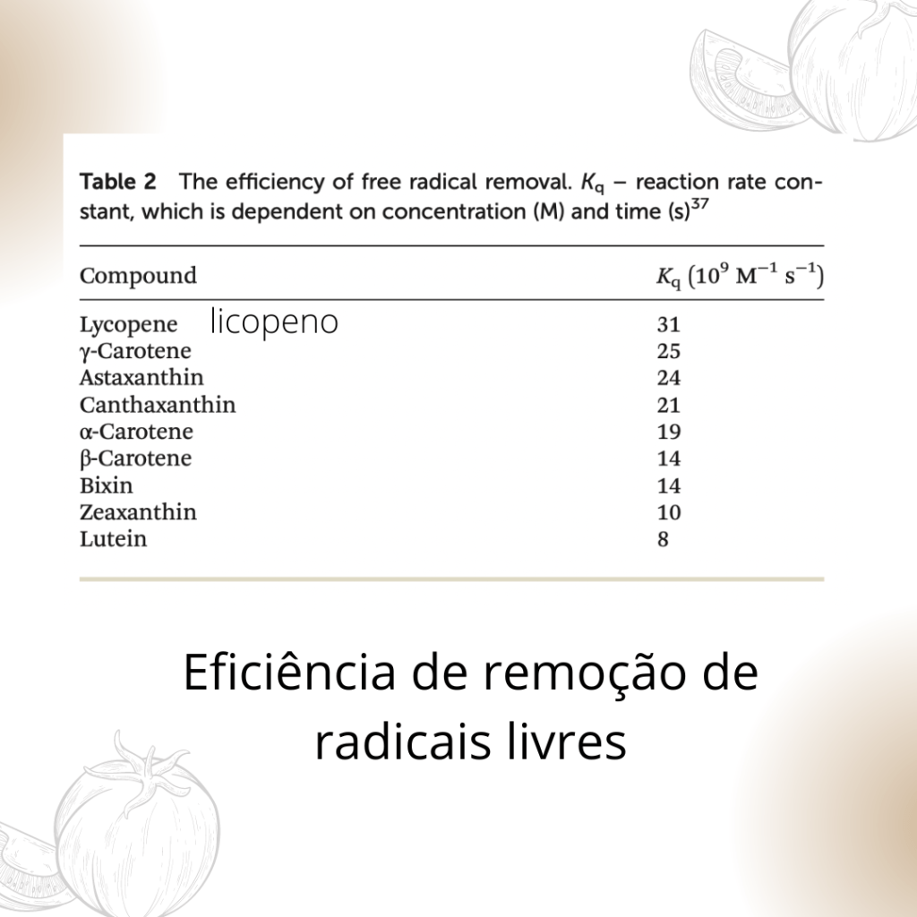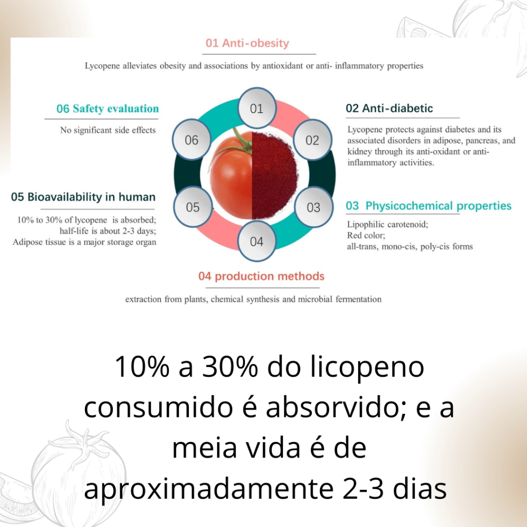 O efeito antioxidante do licopeno supera o do beta caroteno, e de outros compostos também considerados anti-oxidante.  A absorção do licopeno é de 10 a 30%   e a meia-vida de 2 a 3 dias, o que faz necessário, que seja consumido em dias alternados no mínimo, para que possa ser mantido os níveis basais.