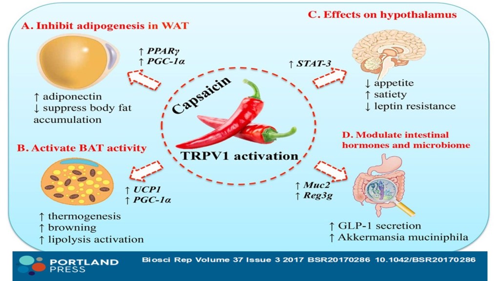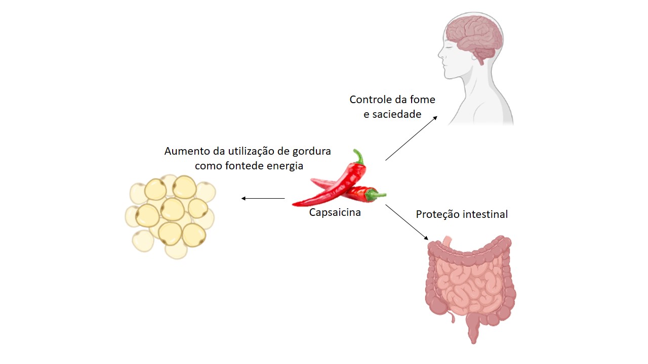 A Capsaicina – presente na pimenta malagueta (Nevius et al., 2011), tem mostrado melhorar a funcionalidade do tecido adiposo. Trabalhos tem mostrado que o consumo de 10mg/Kg de peso dia foi capaz de aumentar o gasto energético, o VO2 e a oxidação de lipídios em pacientes com sobrepeso(INOUE, et al 2007). O efeito no gasto energético pode estar associada ao fato de a capsaicina agir como agonista β-adrenérgico o que estimula a lipólises e termogêneses, fatores que estão associados a provável perda de peso.